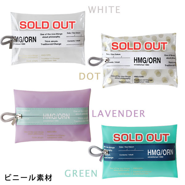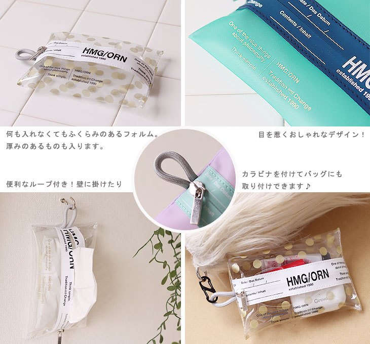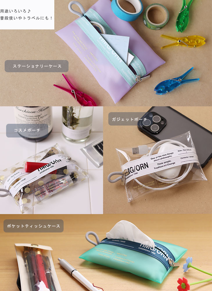 センターにある水が入りにくい「止水ファスナー」が目を惹くカラフルなロゴ入りデザイン。 クリア素材で中身が見えるタイプとスモークタイプ、また綿素材で中身の見えないタイプもあります。 ポケットティッシュもぴったりと収まるサイズです。 普段使いからトラベルにも活躍するアイテムですよ!