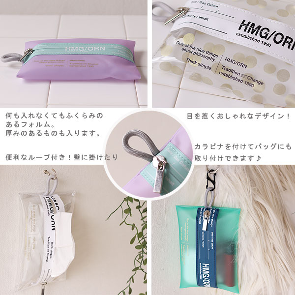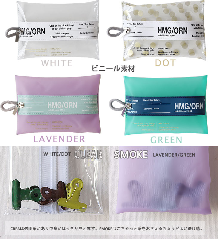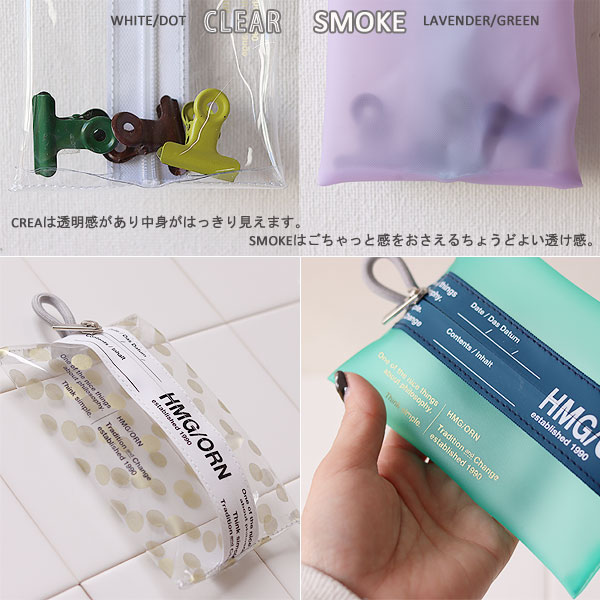 中身が分かるクリアタイプ(WHITE/DOT)と、柔らかなカラーがかわいい不透明タイプ(LAVENDER/GREEN)の2種類をご用意しました。 中央の止水テープがポイント♪ CLEAR(WHITE/DOT)は完全に透けているビニル素材。見せる収納で楽しみましょう♪ SMOKE(LAVENDER/GREEN)は半透明なので見えるけどはっきりは見せない。ごちゃつかずスマートに収納♪