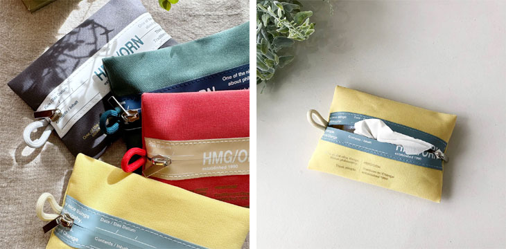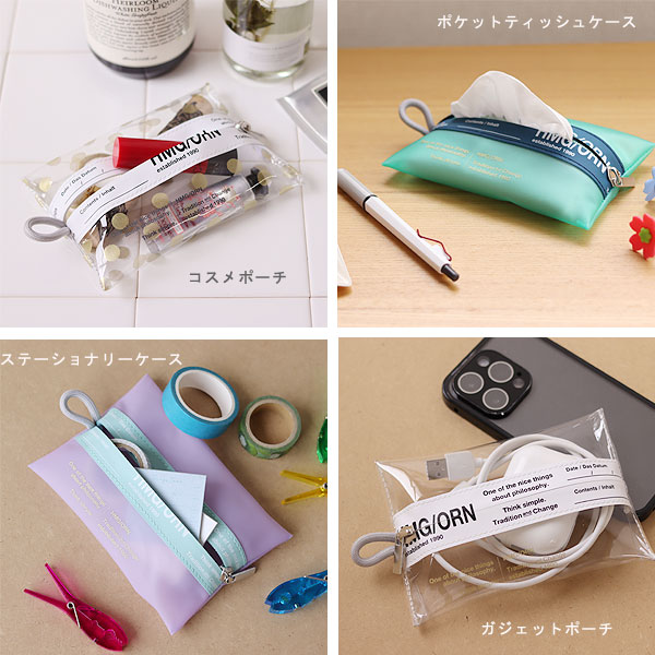 本体はビニル素材なので水や汚れが付きにくく、様々なシーンでお使いいただけます。 このポーチはポケットティッシュがちょうど入るSサイズ。 止水ファスナーはティッシュがひっかからない作りで破らずに引き出すことができます。 ※止水テープを使用していますが縫製品のため、完全な防水機能はありませんのでご注意ください。