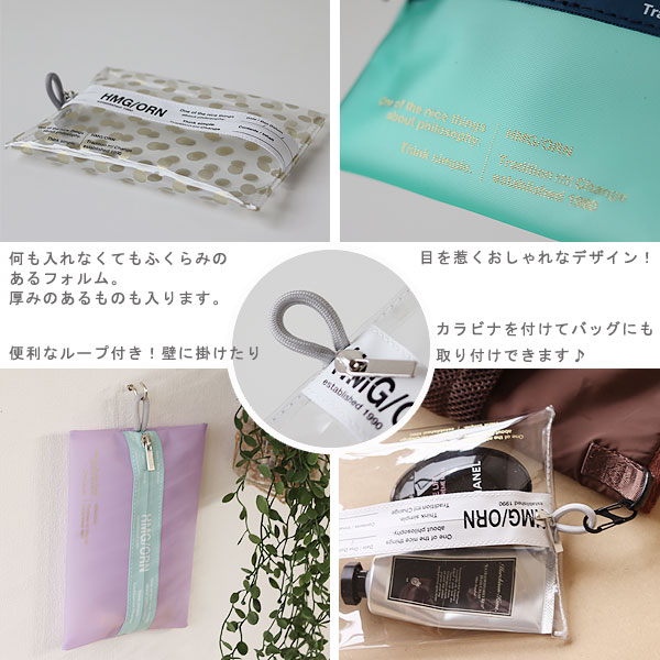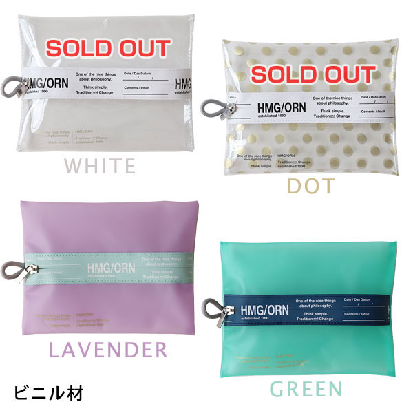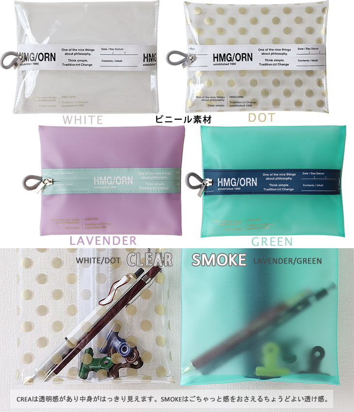 中身が分かるクリアタイプ(WHITE/DOT)と、柔らかなカラーがかわいい不透明タイプ(LAVENDER/GREEN)の2種類をご用意しました。 中央の止水テープがポイント♪ CLEAR(WHITE/DOT)は完全に透けているビニル素材。見せる収納で楽しみましょう♪ SMOKE(LAVENDER/GREEN)は半透明なので見えるけどはっきりは見せない。ごちゃつかずスマートに収納♪