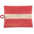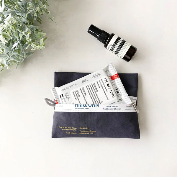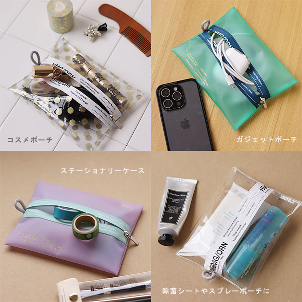センターにある水が入りにくい「止水ファスナー」が目を惹くカラフルなロゴ入りデザイン。 クリア素材は中身が見えるビニル素材なので中身はひと目でわかります。 中身の見えない綿素材も登場しております。 除菌シートやマスク、スプレーが収まるサイズ感です。 普段使いからトラベルにも活躍するアイテムですよ!