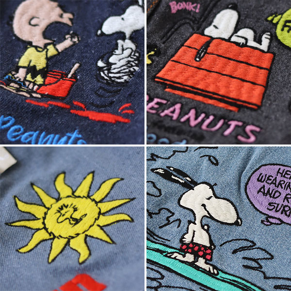 ざっくりと味のある刺繍と製品洗いの風合いが魅力です。 それぞれ個性豊かで愛らしいスヌーピーを楽しむことのできる4柄です♪ ※製品加工の段階で生じる染めムラ・糸切れ・生地切れ等はデザイン上の商品特徴です。