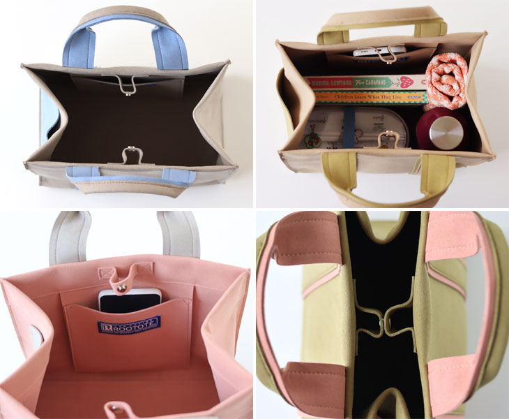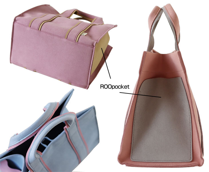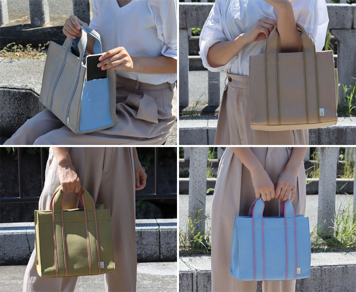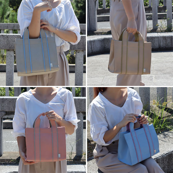 シンプルで落ち着いた色合わせのPearl grayとBiscuit。 まるでかわいいスイーツのような色合いのTea rose・Pistachio・Baby blue・Lilac。 持ち手の裏側とパイピング部分、側面のポケットが差し色になっています♪ バッグをより魅力的に見せてくれる素敵なアクセントカラー、どのカラーリングもとてもかわいくて迷ってしまいそうです。