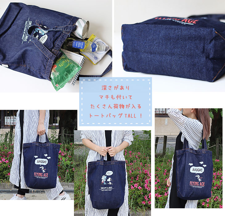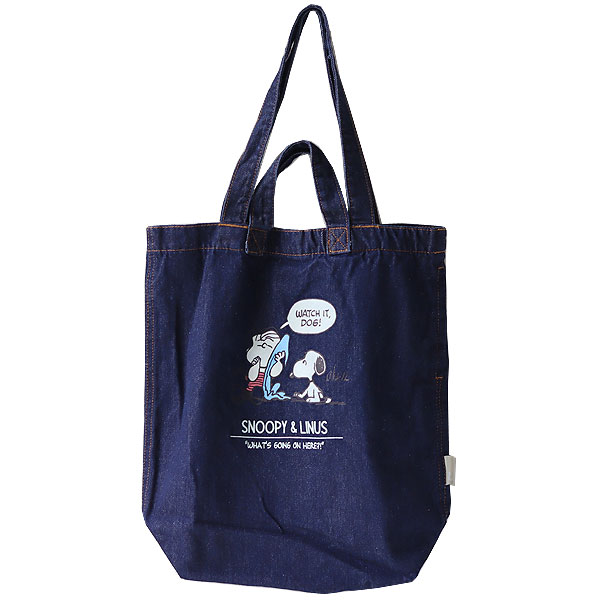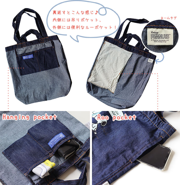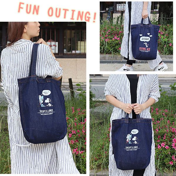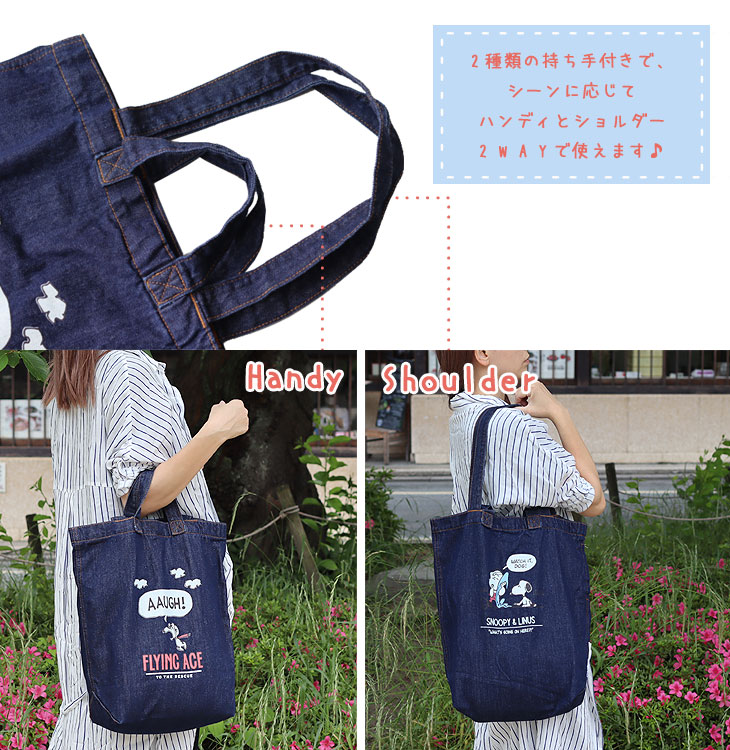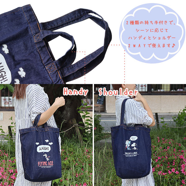 世界中で愛されているキャラクター、PEANUTS柄のデニムトートです。 デニム生地に洗い加工を施すことで、より味や風合いのある仕上がりに。 オトナも楽しんでいただけるこだわりのデザインです。 長さが異なる便利な2種類の持ち手がポイント! 用途に合わせて手持ち、肩掛けと使い分けができる2wayトート。 軽くてA4サイズのファイルなど、荷物もたっぷり入ります! 荷物の多くなりがちな旅行の時にはサブバッグとしても使えて便利です。