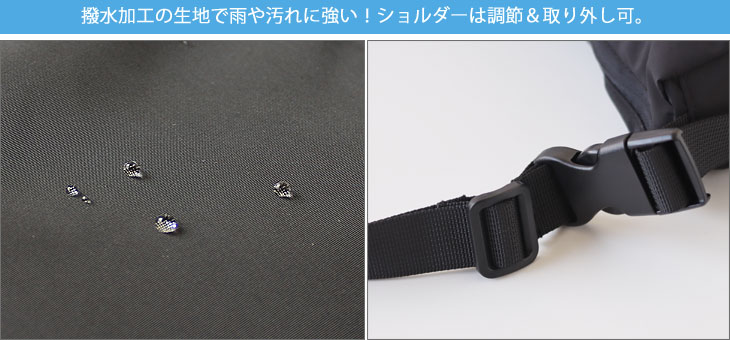 耐久性に優れており、汚れにも強いところがアウトドアにぴったりです。 ショルダーの長さも調節可能なのが嬉しいポイントですね。 ※この製品は防水加工はされておりません。はっ水加工はされておりますが永久的なものではなく、使用頻度により徐々にはっ水効果がなくなります。 ※縫目部分には止水加工は施しておりません。 ※雨に濡れた場合はできるだけ速やかに水分を払い落とすか、タオルなどで拭き取っていただき、陰干しにして自然乾燥させてください。水分を放置すると水分の侵入や色落ちの原因になりますのでご注意ください。 ※市販の撥水剤をご使用いただくことも可能ですが、撥水剤の塗布によるムラができないか目立たない箇所で狭い範囲で試してからお使いください。