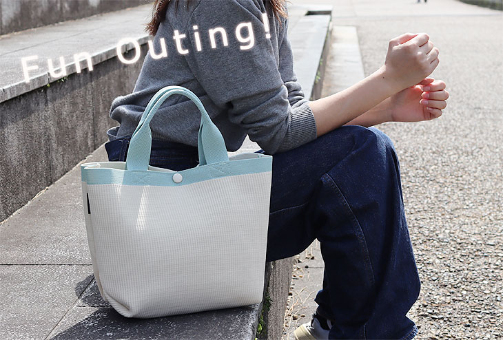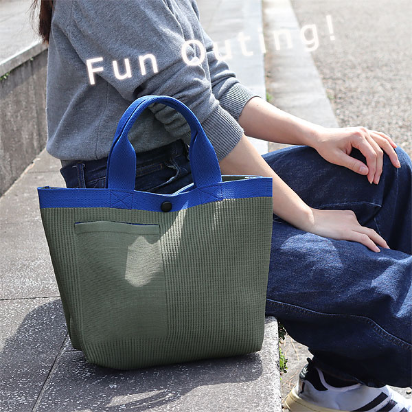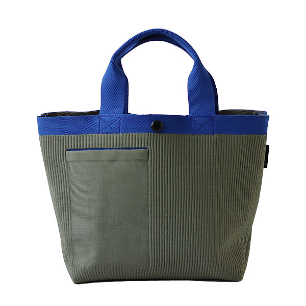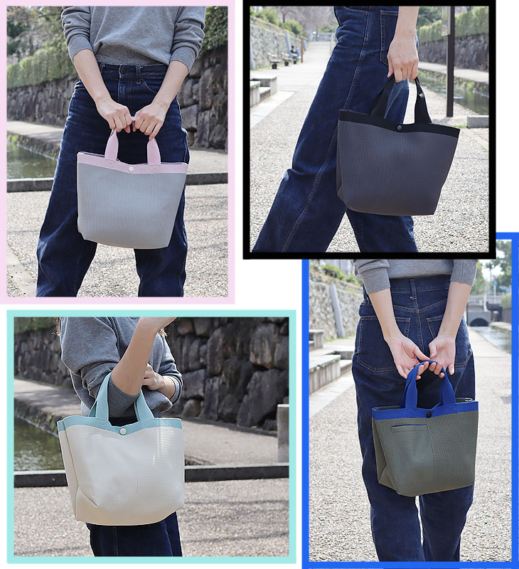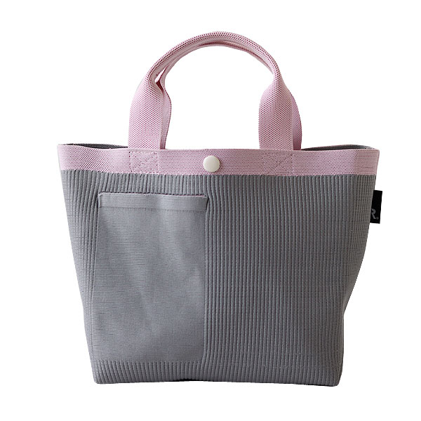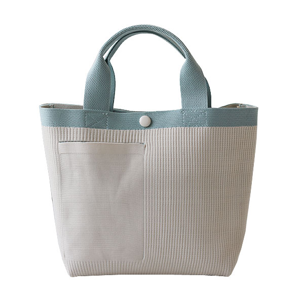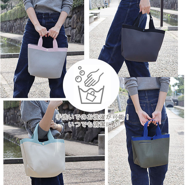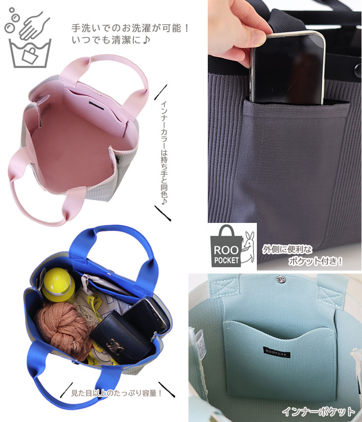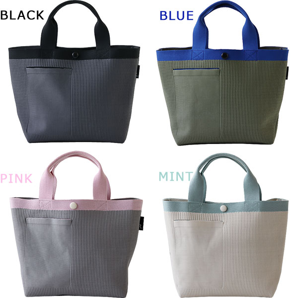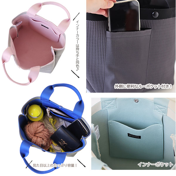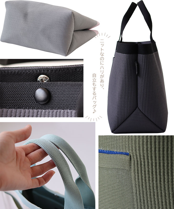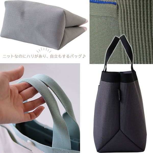 トートバッグのパターンに合わせて、パーツごとに生地を編み立てていくので、製造時の端材を最小限に抑えることができ、生地端の処理も不要。 無駄の少ない製法でつくられました。 サラリとした手触りは暑い季節にもベタつかず、快適です。 お仕事にもプライベートにも、様々なシーンにマッチ。 ニットなのにハリがあり、自立もするバッグ! 丸洗いできるのも嬉しいポイント♪ すっきり収納、出し入れしやすさも魅力です。 ![]() ブラック、ブルー、ピンク、ミントの4カラーをご用意。 シンプルな形状ながら、本体と持ち手のバイカラーがポイント! インナーカラーは持ち手と同色です。 デイリーにお使いいただける、カジュアルだけどきれいめにも持てるトートバッグです。 ※使用ディスプレイ、撮影環境によって商品の色は見え方が多少異なりますので予めご了承願います。