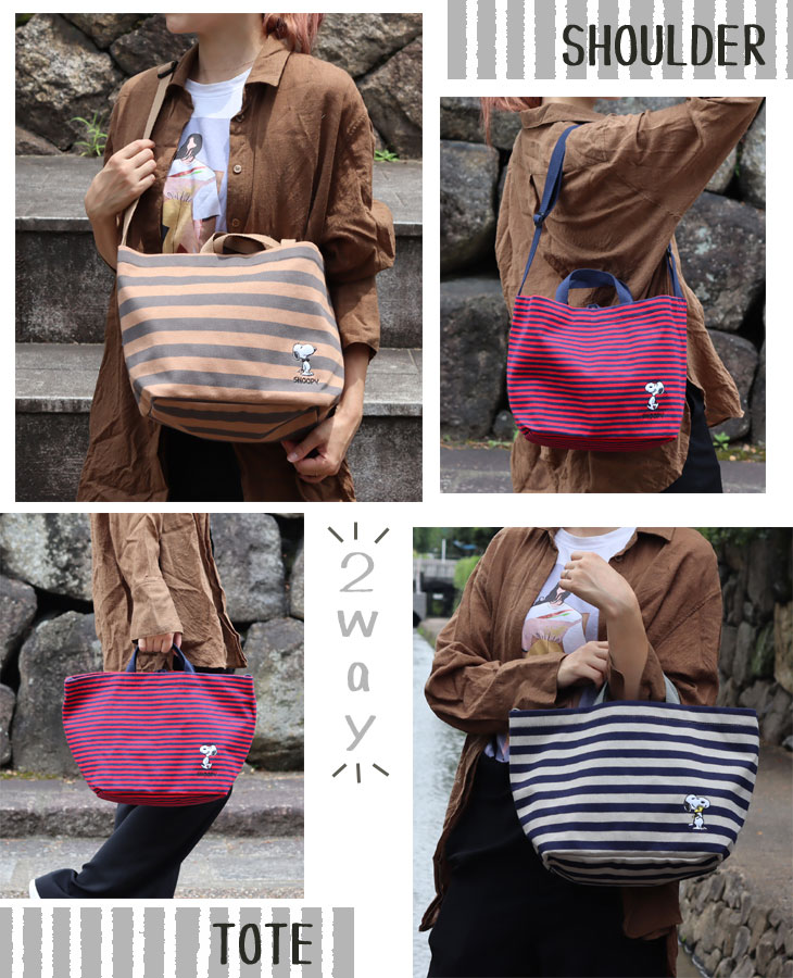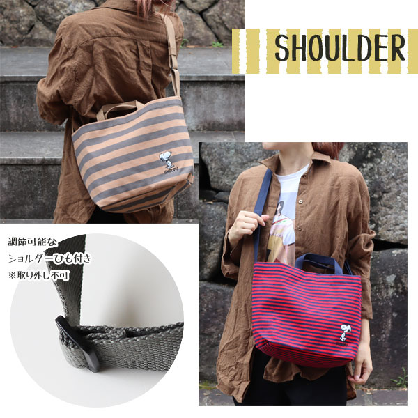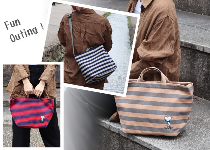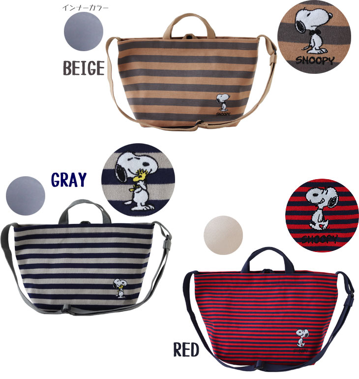 BEIGEはグレーとGRAYはネイビーと、REDもネイビーとのボーダー。 ボーダーの厚みがBEIGE→GRAY→REDと細く異なっているのも特徴です。 軽くて丈夫な綿生地に、裏地はポリエステル。 使いやすい触り心地です。 さらにそれぞれ異なるスヌーピーの刺繍をあしらいました。 なんとも言えない表情に癒されちゃいます♪