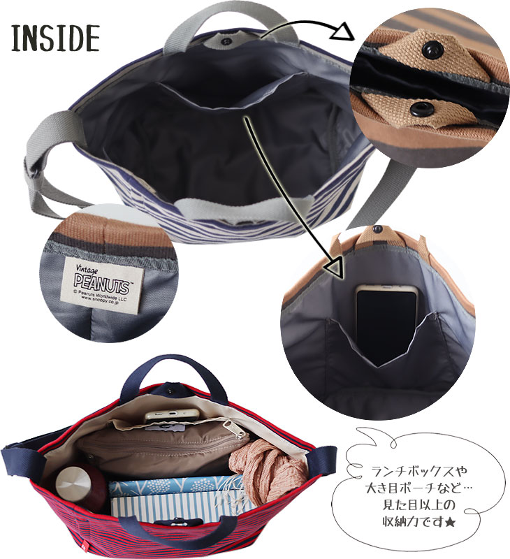 カギやハンカチ、スマートフォンなど、細かいものを分けておくのに便利。 マチもたっぷり、長財布やマイボトルだけでなく、大き目ポーチやランチボックスも入るサイズで、見た目以上に荷物が入って収納力もばっちりです。 開き口が広くがばっと開くのでモノの出し入れがしやすく、中身もパッと確認できます。 嬉しい口元ドットボタン付き♪ 内側にVintagePEANUTSのタグもさりげなく付いています。