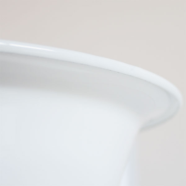 琺瑯は、鋼板にガラス質の釉薬を施し、850℃の高温で焼成したものです。 表面がガラス質のため、油の質と風味を変化させにくく、においがつきにくいという特徴があります。 ひとつひとつ手仕事で黒色の下釉薬(ガラス質)を焼き付け、上釉薬を焼き付けるため、フチ部および表面の釉薬には色ムラや、下釉薬の黒いスジや点が見られます。 琺瑯製品の製造上の過程でみられるものですので、琺瑯ならではの特性としてご理解くださいませ。