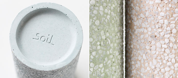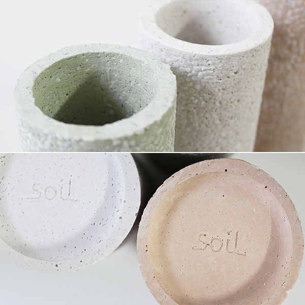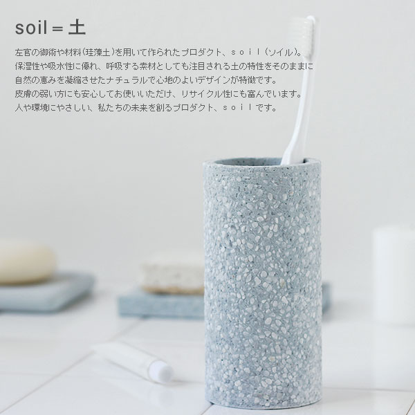 ![]() スタンドに付いた不要な水分を珪藻土がぐんぐん吸い取ってくれるので、歯ブラシをいつも清潔にキープできます。 衛生的で、尚且つ自然素材のみを使用して作られているので人にも地球にも優しいアイテムです。 大きすぎず小さすぎず、主張しすぎないスマートなフォルムが美しく、小さな洗面所にも置けるサイズです。 ![]() 珪藻土に小石を混ぜることでより耐水性の高い配合に。小さな白い小石と珪藻土の組み合わせは質感、 見た目共に温かみのあるデザインです。 スタンドを裏返すとそこにはさりげない"soil″のロゴが入っています。