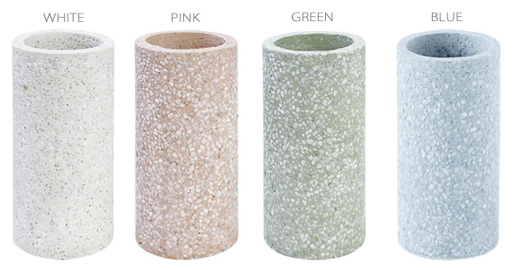 ![]() カラーはホワイト、ピンク、グリーン、ブルーの四種類。四色全て自然の色味で作られています。 美しい自然な色味は置くだけで洗面周りに優しい印象を与えてくれます。