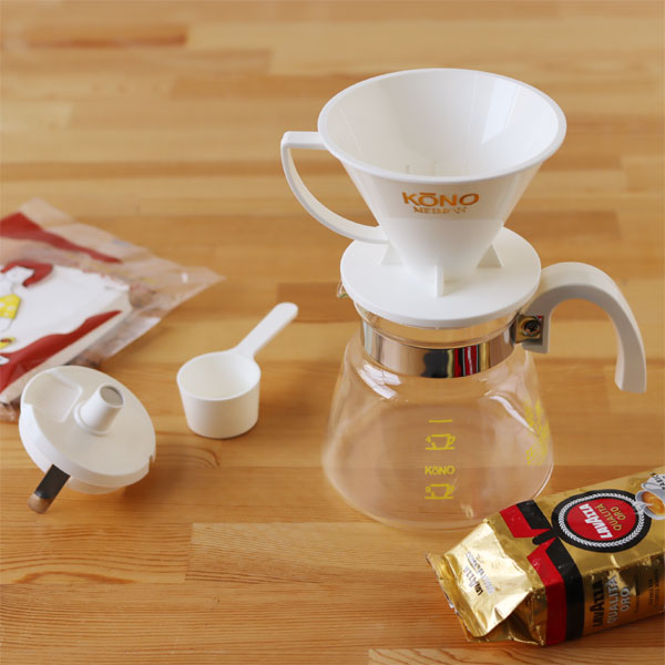 KONO式(コーノ)式とは、珈琲サイフォンを世界で初めて開発した人物、珈琲サイフォン株式会社の社長「河野」さんの名前です。 おいしいコーヒーを入れるために長年研究し、考案されたドリッパーなのです。 「KONO式名門ドリッパー」は、もともとはコーヒー専門店で愛用されていたプロ用ドリッパーです。 コーヒー好きの方たちの間で評判になり、一般にも販売されるようになりました。 KONO式名門ドリッパーはその機能だけではなく、デザインもとてもかわいいのが大人気の秘密。 ぽってりと丸いコーヒーポットに、いろいろなカラーのハンドルが印象的です。 オシャレで機能性も豊かなドリッパーだから、コーヒーを入れるのがとっても楽しくなりそう♪