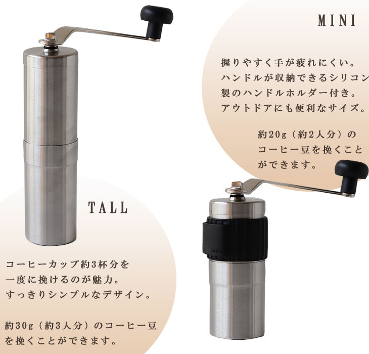 TALLは約30g(約3人分)、MINIは約20g(約2人分)のコーヒー豆を挽くことができます。 握りやすい筒型は持ち運びにも便利なので、アウトドアにも最適! スリムなのでご家庭でコンパクトに収納できます。