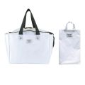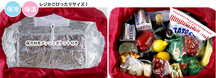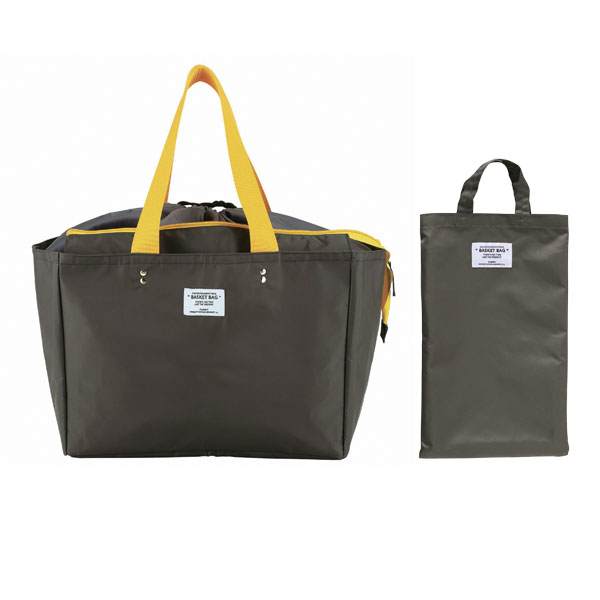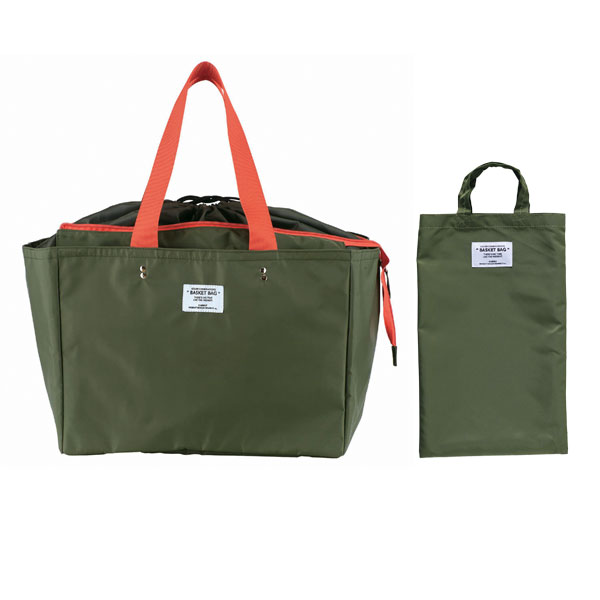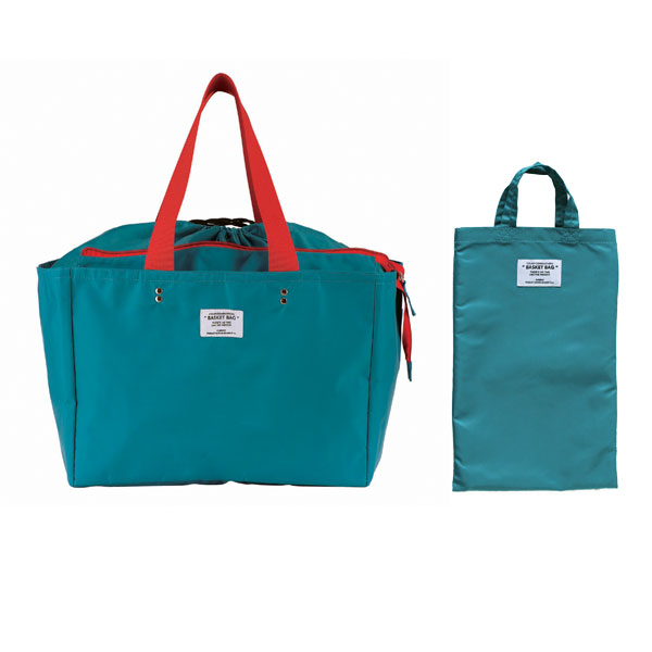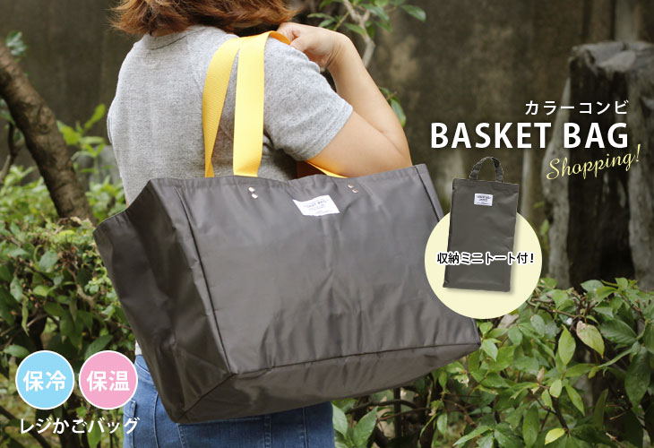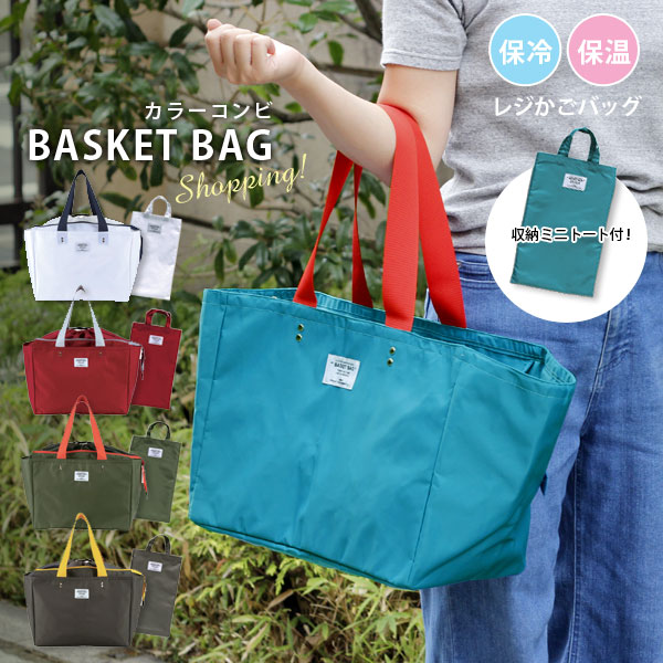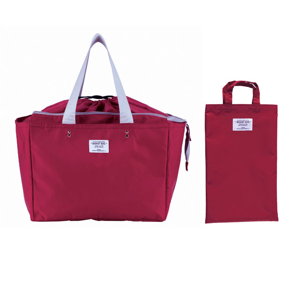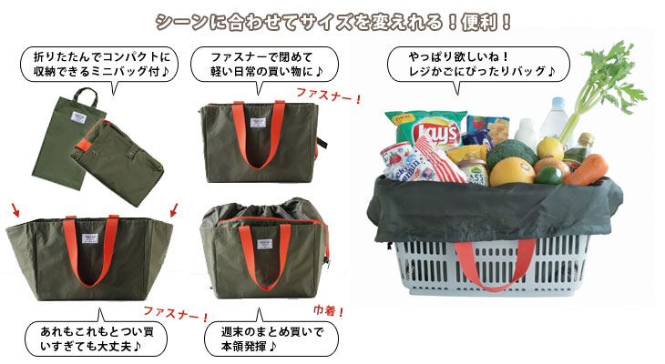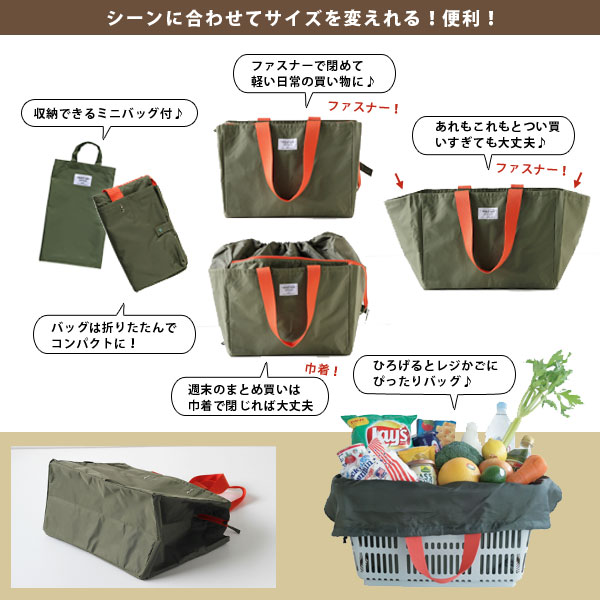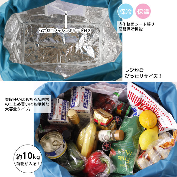日常のちょこっと買い物から週末のまとめ買いまで対応できます。 スーパーやコンビニなどで使われている買い物かご(約33L)のサイズにぴったり収まる形です。 内側は銀面シート仕様で保冷剤用ポケット付き口元はファスナー閉じと巾着閉じの2種類で、買い物の量によって使い分けが可能。 中に入れたものがぐずぐずと動いてしまうのも防げます。 肩紐も幅があり、作りもしっかりしているので安定して持ち運びができ安心です。 使わないときは折りたたんで付属のミニトートへ収納可能。 完全防水ではありませんが、厚みのある生地のポリエステル素材なので、多少雨が降っても大丈夫♪