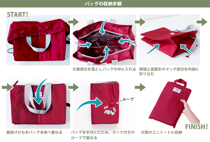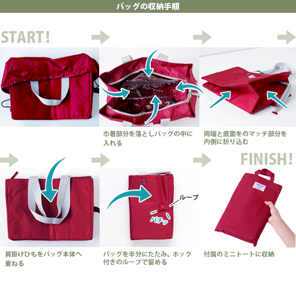 バッグはコンパクトにたたむことができ、フック付きのループで留めればOK! そのままバッグに入れてもいいですし、付属のミニトートへ収納すればとってもすっきり! ミニトートはサブバッグとしても活躍します。 バッグを使用時はループは本体サイドにあるフックに留めれるので、じゃまになることもありません。 細かいところも考えられていてうれしいですね♪