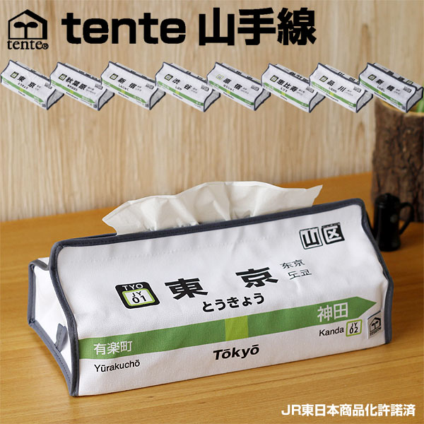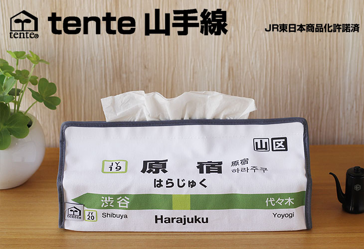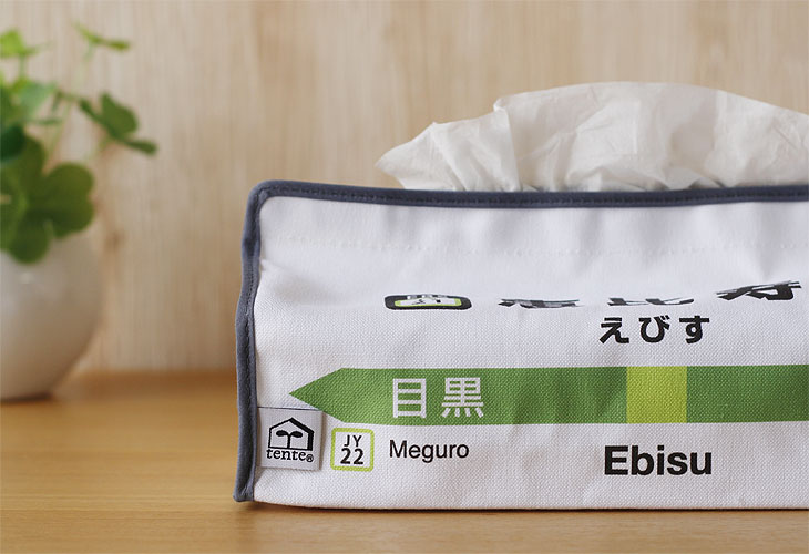 JRの山手線の駅看板をモチーフにしたtenteが生まれました。 後ろ側は看板の行き先が全て反対方面のデザインになってます。 このテンテで、ティッシュボックスを包み込んだらお部屋もガラリと変わっちゃいます♪ 日常的に必要とされながら、そのままでは人目にさらしたくないティッシュボックスは、 その生活感ごと、このテンテで包み込んでしまいましょう。