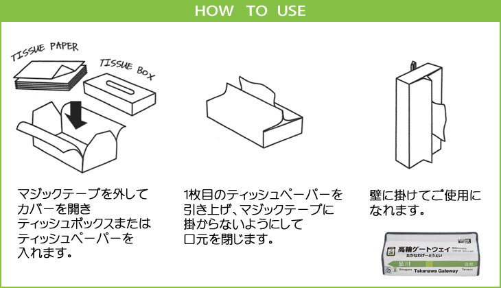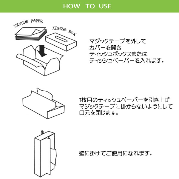 マジックテープが両端についているので、まん中からティッシュボックスを入れマジックテープを止めるだけ。 出し入れもスムーズにできますよ。
