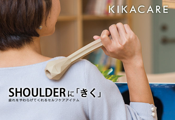 -KIKACARE- KIKA CARE/キカケア は、しっかり「 きく 」カタチを幾何形態にレリーフしました。 シリコン素材の細長いスティックの形状でしなりがあり「小さな動作で程よい刺激」を伝えることができます。 この素材は寒い季節でも冷っとせず、ホールド感もあるので持ちやすい! KIKACAREの幾何形態にレリーフで身体にちょうどいい刺激が伝わります。 大きな動作は必要ないので椅子に座ってリラックスした状態で「トントントン」と叩いてみてください。 スティックの長さがあるので肩だけでなく背中や肩甲骨まで届きますよ。