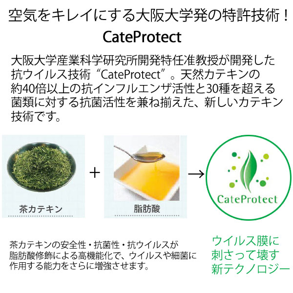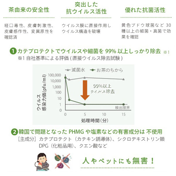 消臭と心地よい香りでリフレッシュ。 お茶由来で人に優しく、ウィルスや細菌をしっかり除去してくれる大人気の抗菌抗ウィルスウォーター「お茶のちから」からアロマの効果をプラスしたマスクスプレーが登場。 消臭・抗ウイルス・抗菌効果を持つ特許技術「カテプロテクト」配合のマスクスプレー♪ 「カテプロテクト」は大阪大学産業科学研究所 開發邦弘 特任准教授が開発した、カテキンをベースとした新しい抗ウイルス・抗菌技術です。 手軽で持ち運び可能なスプレータイプのアロマの香り付き。 マスクの外側にシュッとひとふきするだけで、抗菌・消臭・ウイルス除去対策。