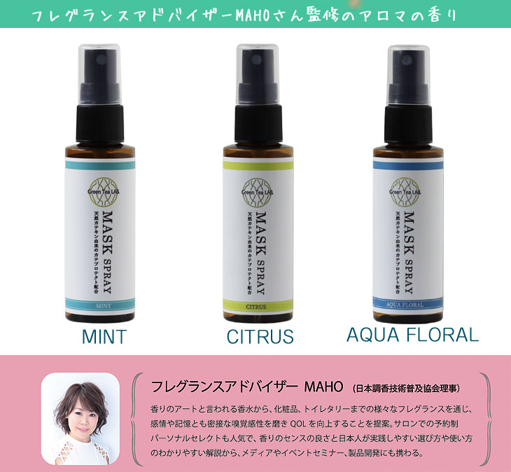 AQUA FLORAL、MINT、CITRUSより、お好みの香りをお選びください。 マスクにスプレーすると、アロマの香りでリフレッシュ♪