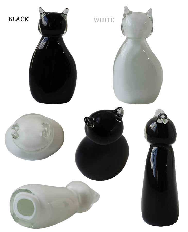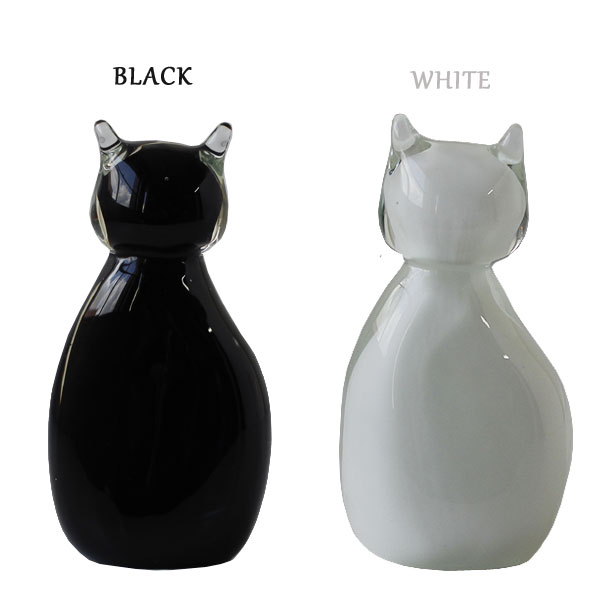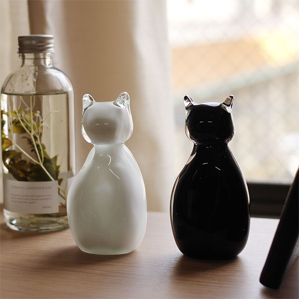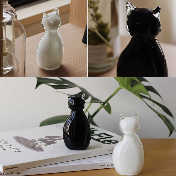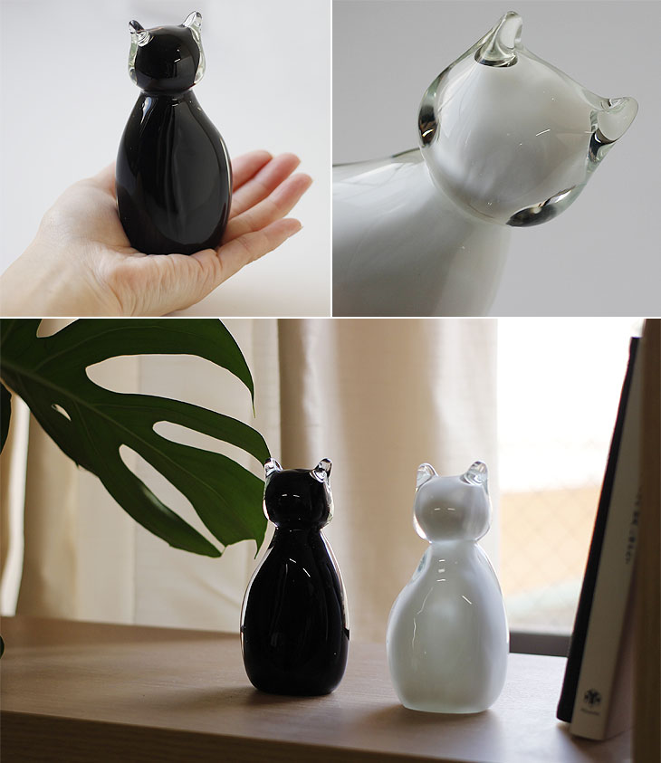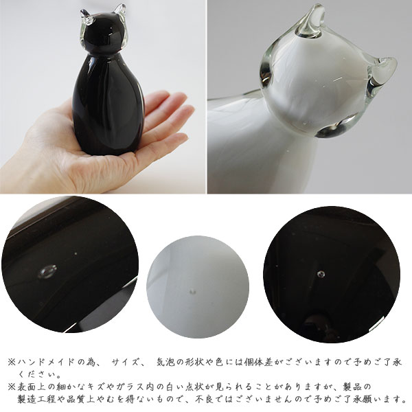 ひとつひとつが、個性を持つ猫 ひとつずつハンドメイドで制作したからこそ個体差があり、ひとつとして同じものはありません。 それぞれ違った色ガラスや気泡の出方や、耳や顔の大きさなどフォルムの違いは本物の猫のような個性です。 白・黒の2色展開で、部屋の中に複数体取り入れることで兄弟・姉妹のようににぎやかな印象になるのも面白いところ。