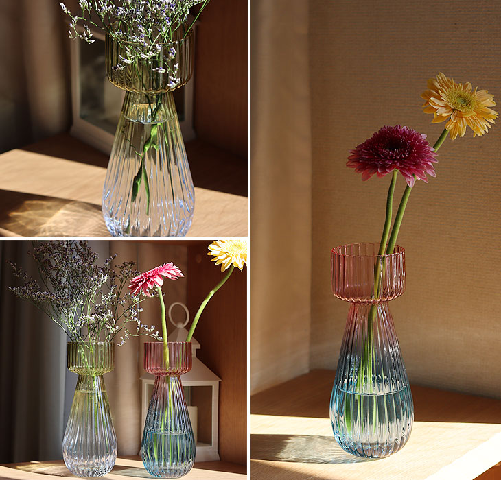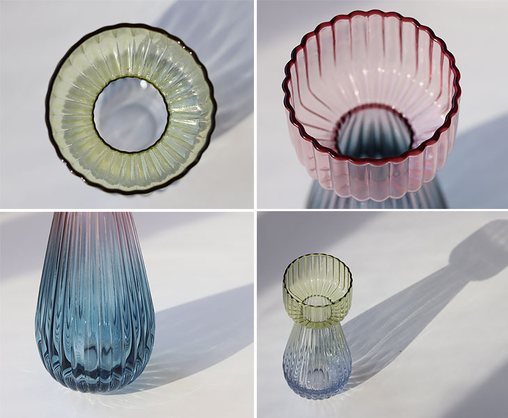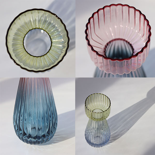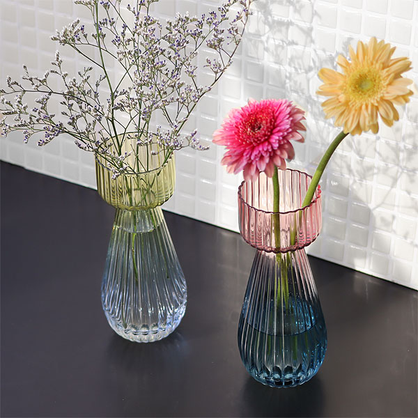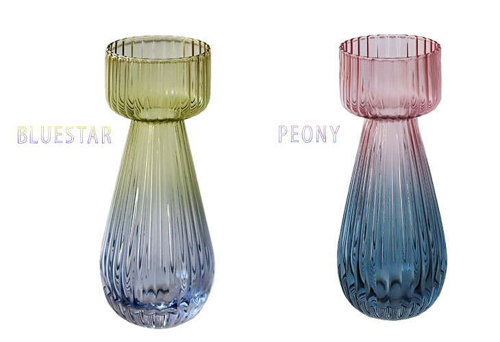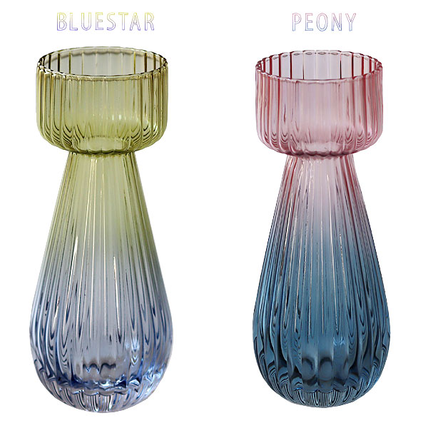 お花のようなかわいい波ガラス。 中にどんなお花を飾るかで合うカラーを選ぶのも◎ ・BLUESTAR…夜空に浮かび上がる輝く星のような青紫と黄色のグラデーション。 ・PEONY…華やかで美しい芍薬の花をイメージしたピンクと青紺のグラデーション。 ![]() ガラスとグラデーションのコンビが、涼やかで美しいフラワーベース。 上部が受け皿のようになりくびれがあるので、ヒヤシンスやクロッカスなどの球根や、サボテン等の水栽培もおすすめです♪ 底は丸く、ユニークでおしゃれな形状です。