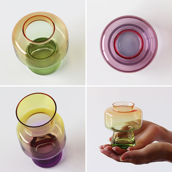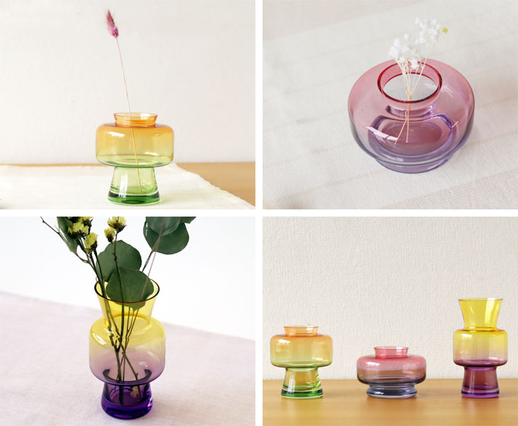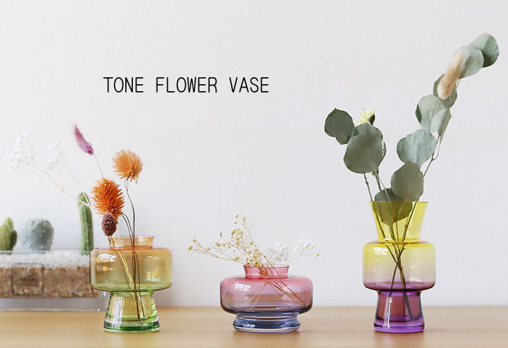 お花を入れる時にその色の魅力を楽しんでみてください。 色と形でそれぞれ雰囲気が異なり、中に入れるものや置く場所でまた雰囲気の変化を楽しめるトーンフラワーベース、生活の中で見せてくれる色々な表情を楽しんでください。 |