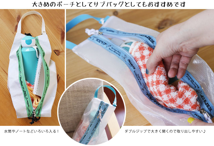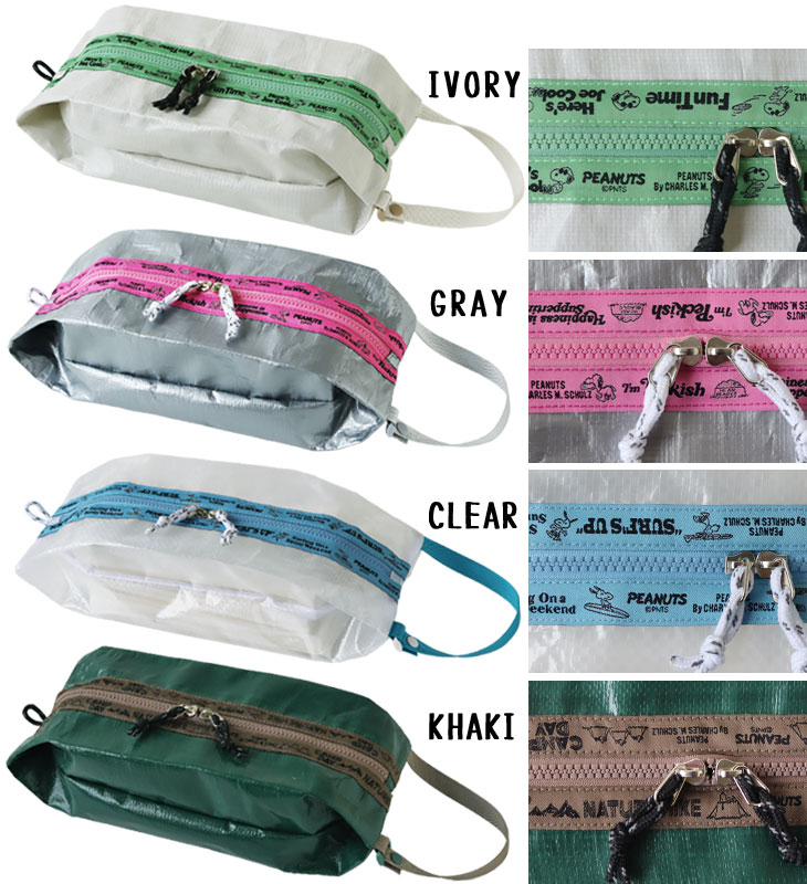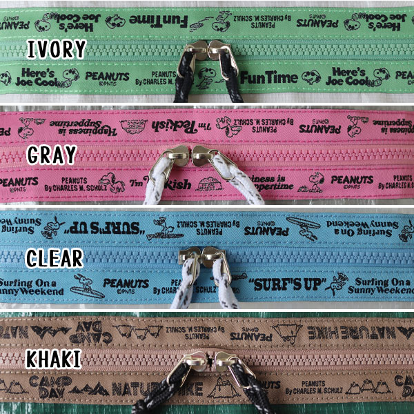 ファスナー部分に印刷されているPEANUTSのイラストがかわいい! ・IVORY(グリーンのファスナー) 「Here’s Joe Cool」ジョー・クールが寝転んだりフリスビーで遊んで楽しんでいます。 JOE COOLとは妄想大好きなスヌーピーが、妄想の中でしている変装の一つです。 ・GRAY(ピンクのファスナー) 「Happiness is Suppertime」どうやらごはんの時間のようです。スヌーピーはお腹いっぱいかな? ・CLEAR(ブルーのファスナー)半透明で程よい透け感! 「SURF’S UP」スヌーピーが海でサーフィンを楽しんでいます。とても楽しそう! ・KHAKI(ブラウンのファスナー) 「NATURE HIKE」山でキャンプの一日。スヌーピーはテントの上でくつろいでいますよ。