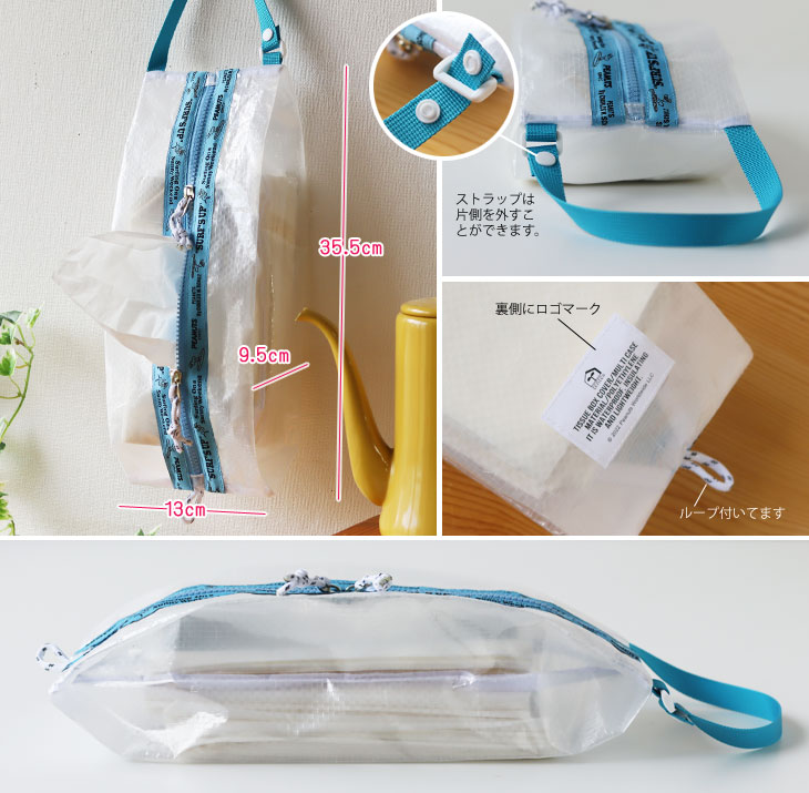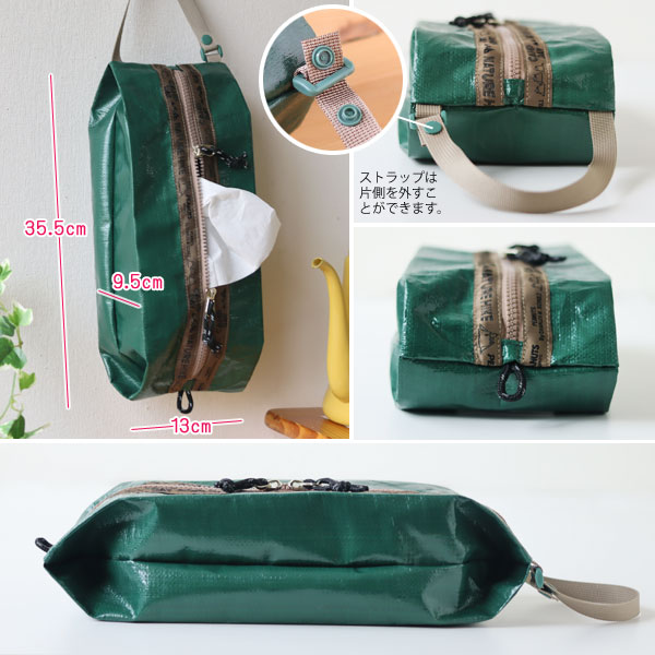 大き目のストラップは持ち手にもなり移動もしやすくサブバッグとしても活用できます。 ストラップの片側はスナップボタンで取り外すことができ、車のヘッドレストに取付けることもできます。 撥水性のある生地で屋外でも扱いやすく、ファスナーを閉じればティッシュも保護できます。 ダブルジップのファスナーは好みの位置で開けたり、開く幅も自由に変えることができます。