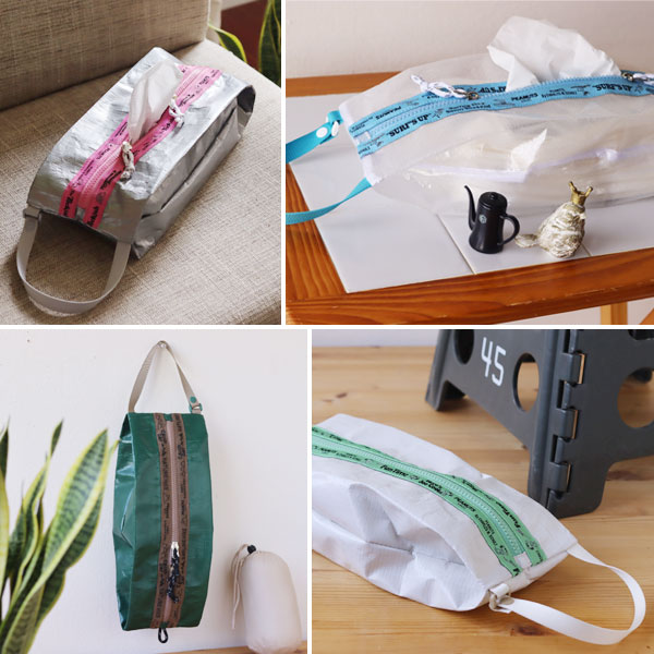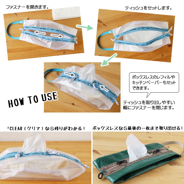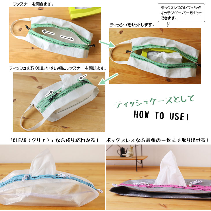 ファスナーを開けてボックスレスのリフィルやペーパータオルを入れてティッシュケースに。 ペーパーを引き出すのに必要な幅だけファスナーを閉じれば完成です。 使わない時はファスナーをとじておけばホコリは入らず安心です。 アウトドアでのレジャーやスポーツの時には砂やホコリからガードしてくれます。 ケースの左右には折り目が入っているので、折り目を内側に折り込むと平たい状態になりコンパクトに。 ペーパーが少なくなればケースも平らになっていくので最後の一枚まで無理なく取り出しやすい!