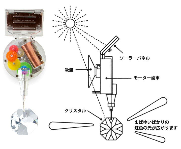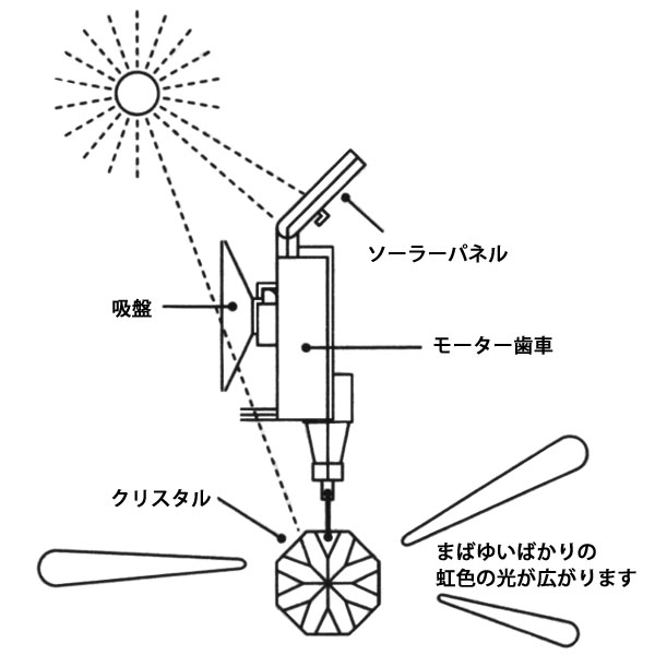 クリスタルに反射した太陽光が虹色の小さなカケラとなってお部屋いっぱいに広がります。 ソーラーパネルに太陽光が当たらなくなると回転が止まります。