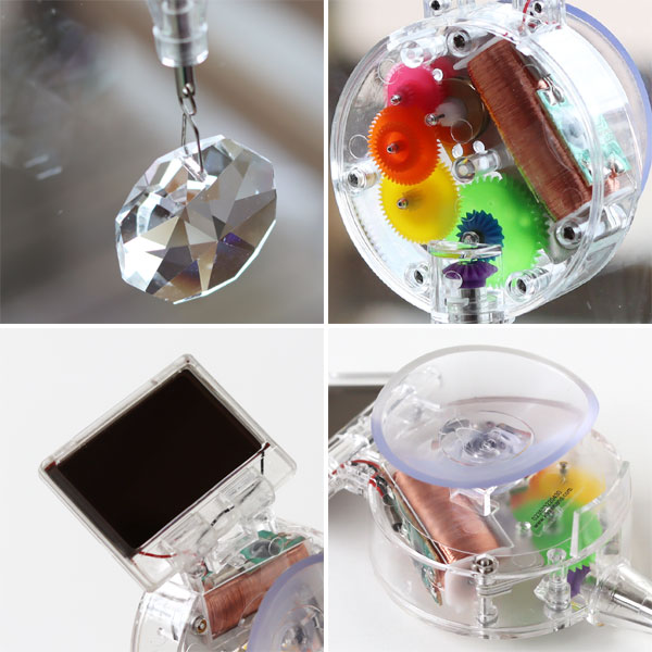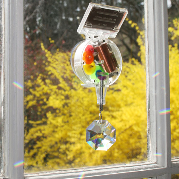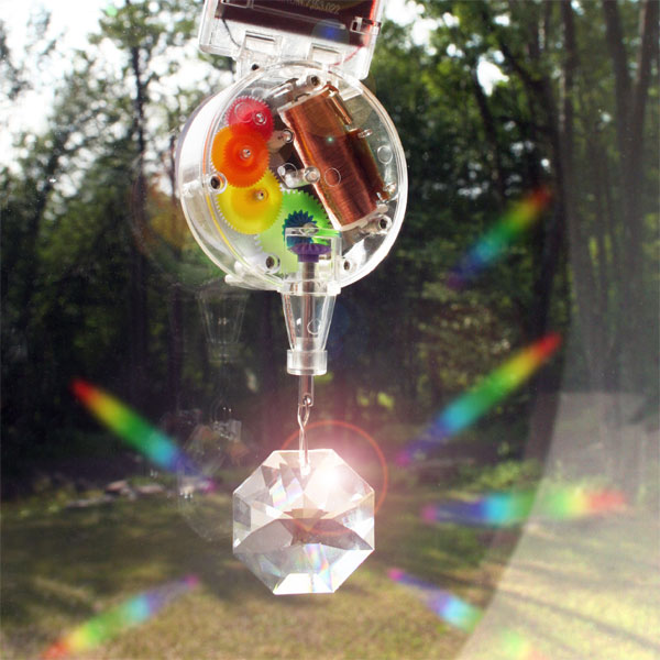 ソーラーパネルが光を受けて作動するよう、ソーラーパネルの角度を調整し、歯車を回転させます。 歯車がクリスタルを回転させ、お部屋を動き回る美しい虹を作り出します。