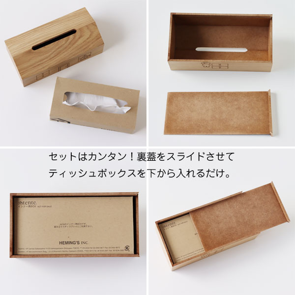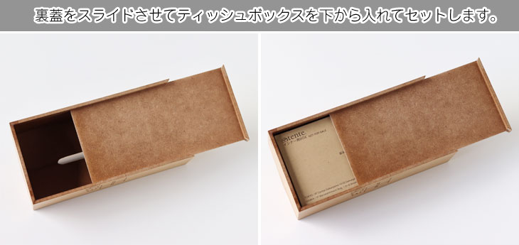 ★ティッシュの入れ方★ 1.ティッシュケースの裏側に、スライド式の裏板があります。 2.裏板をスライドさせて開口します。 3.ソフトパックティッシュをセットして、裏板を戻します。 ティッシュのセット方法が簡単なのも使いやすい、嬉しいポイントですね♪