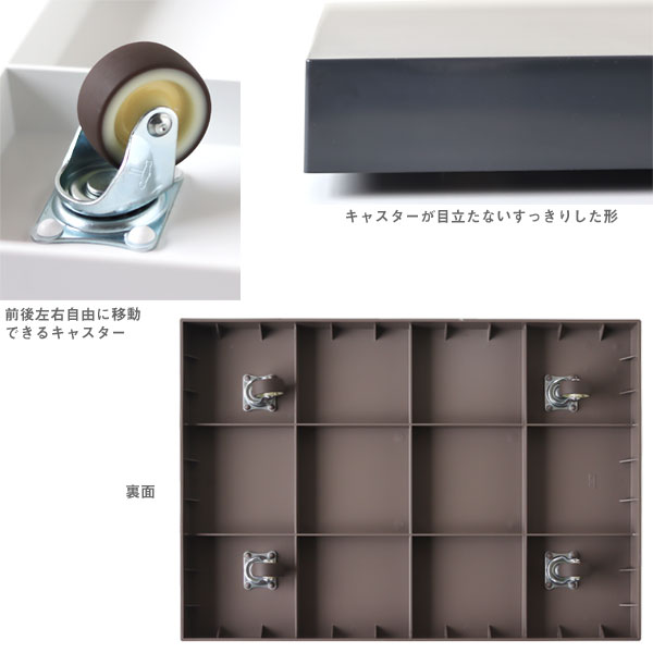家の中の重いもの・移動しにくいものを載せて、簡単に動かすことができるキャスター付きトレイです。 天面・側面ともにフラットになっているので、部屋の角にピッタリと収まってくれます。