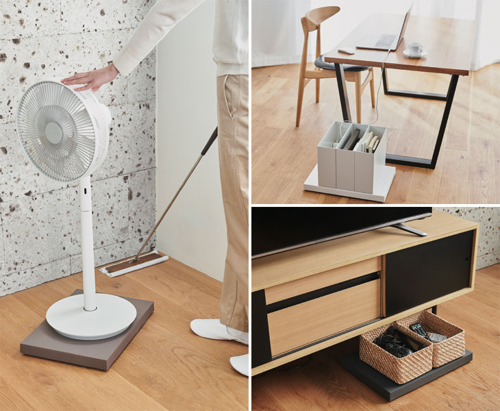 必要アイテムをファイルボックスにまとめて入れておけばリモートワークの際にお役立ち♪ 加湿器や空気清浄機、扇風機などの家電類を掃除・片付けの際に移動させるのも、 「tidy Platform」に載せておけばラクラク!簡単に動かすことができます。 ソファーやベッドの下に置いているカゴなど、床に直置きしている収納類も 「tidy Platform」を使えばサッと引き出すことができるので使い勝手の良さがアップ♪ 読みかけの本や雑誌を積んで置いておいたり、ライフスタイルに合わせて様々な使い方が可能です。