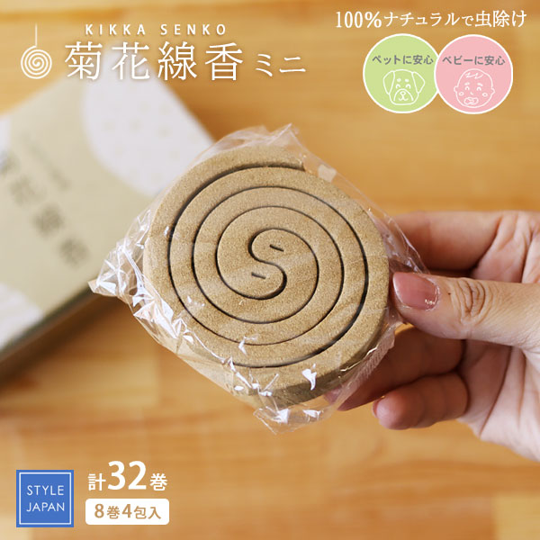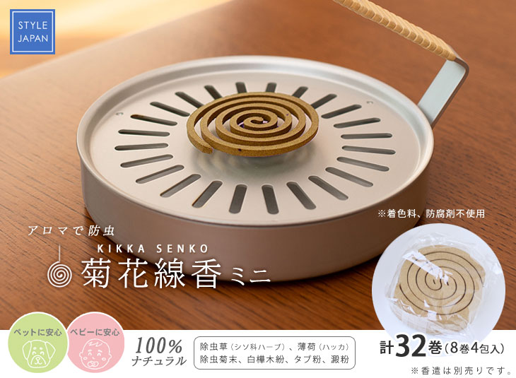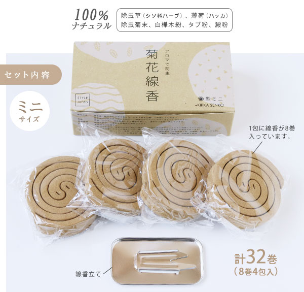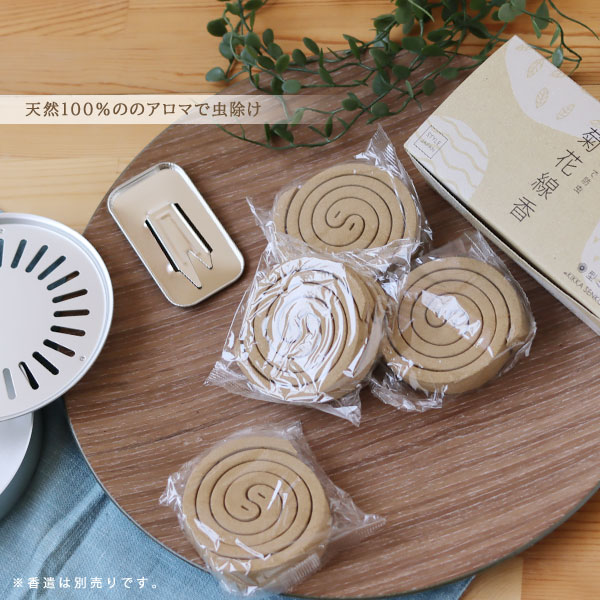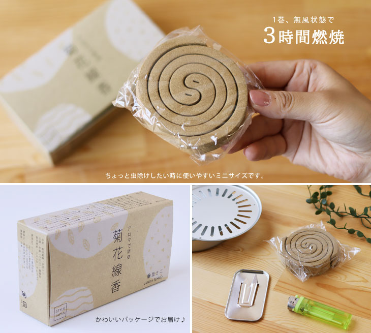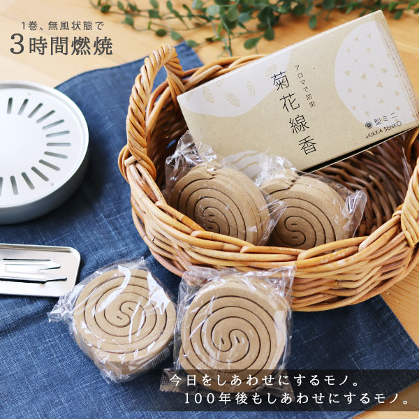 ケミカル成分を含まない100%ナチュラルな素材で作られた虫除け線香「菊花線香」のミニサイズです。 殺虫効果が高く安価なケミカル成分は虫を殺虫するだけでなく私たちの体にも影響があると考えられています。 「虫を殺すのではなく、嫌がる煙をたくことで虫刺されを防ぐ」 除虫菊や薄荷(ハッカ)などの自然の素材を用いた昔ながらの虫除け線香です。 昔は天然の除虫菊を使った蚊除け線香として人々に親しまれていました。 時代の変化とともに大量消費に対応するために、殺虫効果が高いケミカル成分を使用したものに置き換わっていきます。 国内で除虫菊を栽培する農家が少なくなる中、「りんねしゃ」さんが再現に取り組んでこられました。 自社農場で栽培された除虫菊など天然の素材で「菊花線香」は作られています。 赤ちゃんやペットにも安心して使える蚊取り線香を選びたいですね。