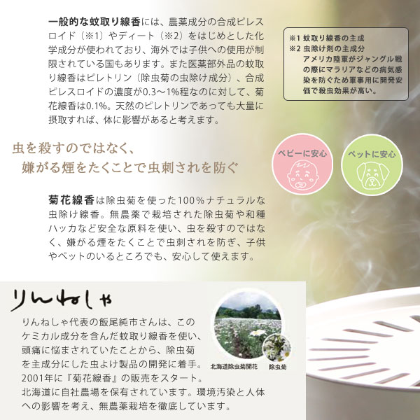 蚊取り線香が日本で発売されたのは1890年(大日本除虫菊)。 天然の除虫菊(ピレトリン)を使っていましたが、第二次世界大戦後、 大量消費に対応するために、殺虫効果が高い合成ピレスロイドが使用されるようになりました。 ・菊花線香が『医薬部外品』ではなく『雑貨』なワケ 一般的な医薬部外品の蚊取り線香はピレトリン(除虫菊の成分)、合成ピレスロイドの成分が0.3〜1%、 それに対して菊花線香は0.1%。天然のピレトリンであっても大量に摂取すれば体に害があります。 「菊花線香」は最も優しく虫刺されを防いでくれる虫除け線香です。 ・プラスアルファの効果を生む薄荷(はっか) 実は、ほとんどの虫除け線香には防カビ剤が使用されています。 りんねしゃは、この防カビ剤の代わりに「薄荷」を使用しており、菊花線香の特徴の1つでもあります。 「薄荷」は防カビ剤としてだけでなく、天然の消炎、鎮痛、抗菌、消臭の他、 ストレス発散など多岐に渡る効能も持っている、万能な植物なのです。 りんねしゃ代表の飯尾純市さんは、このケミカル成分を含んだ蚊取り線香を使い、 頭痛に悩まされていたことから、除虫菊を主成分にした虫よけ製品の開発に着手。 日本には除虫菊を栽培する農家がほとんどなく、かって日本人から除虫菊の栽培を伝授された 中国の農家と契約してりんねしゃの除虫菊栽培がスタート。 初収穫は1997年のこと。 そして2001年に『菊花線香』の販売をスタートさせます。 現在、りんねしゃは北海道に自社農場を構え、日本で栽培が激減状況にあった「除虫菊」と「ハッカ」の栽培を開始。 環境汚染と人体への影響を考え、無農薬栽培を徹底しています。 虫除け商品は様々ありますが、世に多くある防虫剤や防虫スプレーの危険性を指摘している国もあります。 そんな中、「菊花線香」は、飯尾さんの思いとともに、100年後の未来にも届けたい商品です。