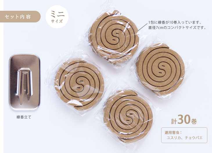 かわいいパッケージに線香が32巻き入っています。 8巻ずつパックされているので残っても鮮度保って次の夏に使えます(未開封であれば3年保存可能)。 パックに分かれているのでお友達と分け合うこともできますね。 丸形ミニはコンパクトで場所を取らず、かつひと巻も一回使い切りサイズ。 夜寝る前にわざわざ火を消さなくてもOKです。 線香は、組合わせの2巻から、必ず1巻ずつ離して使用してください。 線香立ての打ち抜き部分を起こし、線香の中心の穴に水平に差し込んでください。