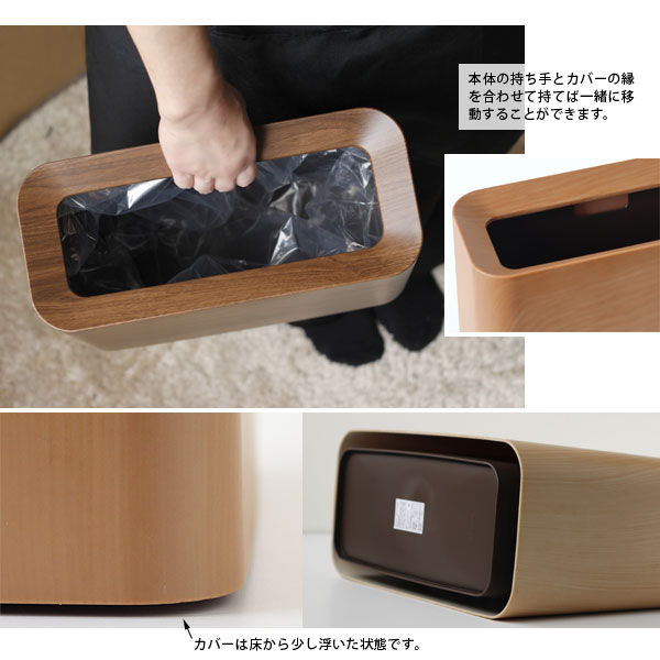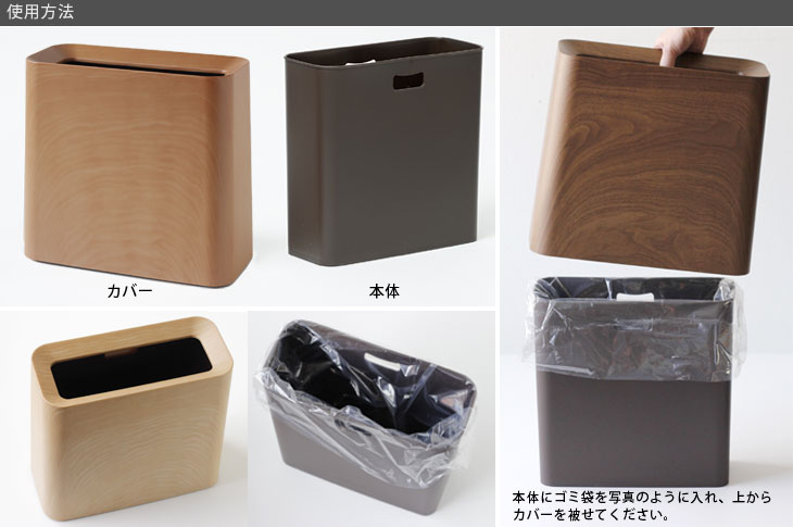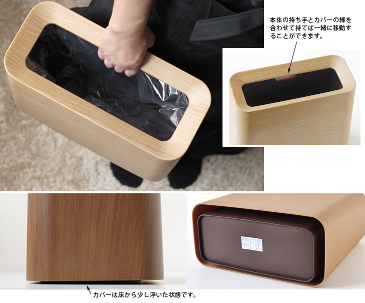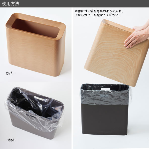 セットの仕方はとても簡単です。ゴミ袋を本体にセットし、上からカバーを被せるだけでOK。 カバーを被せるだけでゴミ袋を隠せます。お部屋の美観を損ねることがありません。 持ち運びも簡単!カバーの縁と本体にある取っ手を合わせて持つだけです。 カバーは本体に被せた状態で床から少し浮いていますので、カバーのエッジで床を 気づ付けにくくなっています。