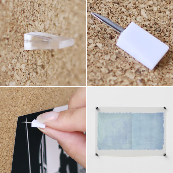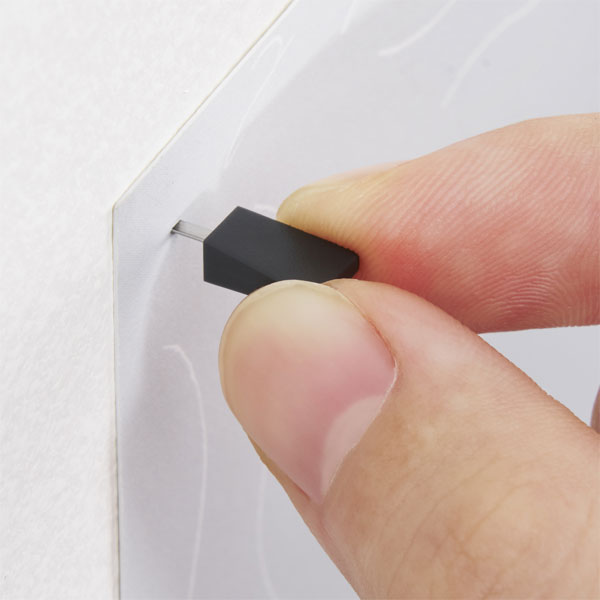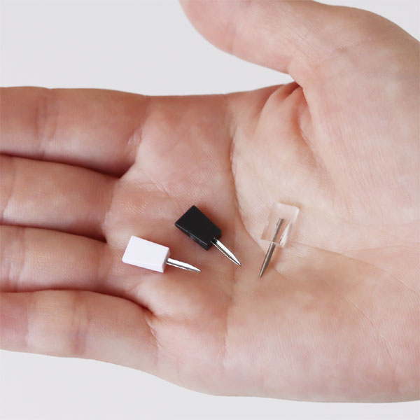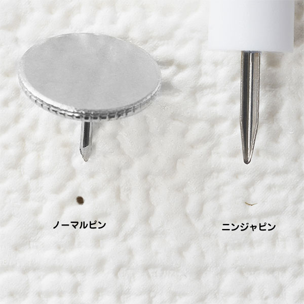 ニンジャピンはL字の断面形状にすることにより、ピン跡が目立ちません。 少し凹凸があり薄い柄・色のついた壁であれば、ピン跡を探してもなかなか見つけられないほどです。 これにはかなりの驚き!まさに壁にやさしい画びょうです。 ピン跡を残したくない場所、ピン跡を残せない賃貸などにもぴったりですね♪