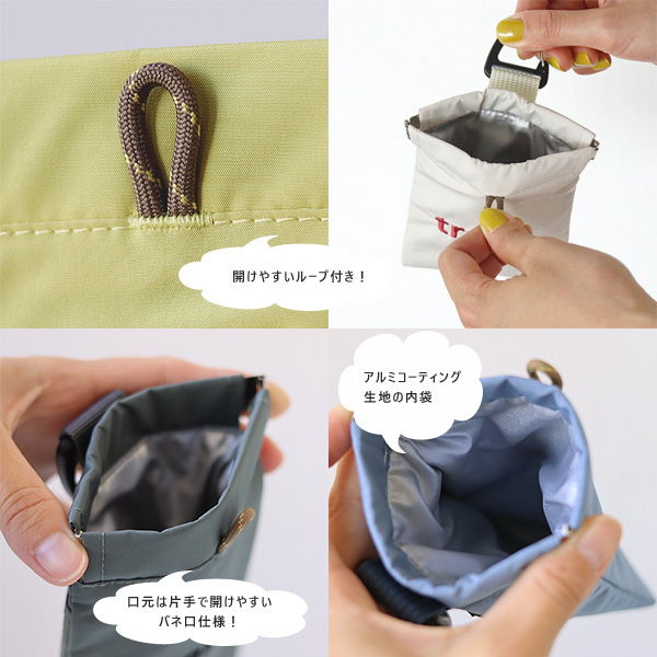 ごみ入れとしてだけでなく、ポーチとして、リップや目薬などのコスメやイヤホン、鍵などを入れても◎ アウトドアやレジャーのおともにおすすめです! お取り扱い上のご注意 内袋にアルミコーティング生地を使用しております。 不燃性ではありませんので火を近づけないでください。 汚れを落とす際は、内袋を引き出し水や薄めた中性洗剤をつけた布・除菌シート等で軽く拭き取り十分乾燥させてから中に戻してください。 揉み洗いはお避けください。 金属パーツが付属している場合は、小さなお子様の誤飲による窒息の恐れがありますので、十分にご注意願います。 商品を持って振り回したり、過度に引っ張ったりしないでください。 変色・劣化・色移りの原因となりますので、直射日光下や高温多湿な場所での使用・保管はお避け下さい。 水濡れ、摩擦などにより色落ちする恐れがありますので、使用の際は十分ご注意ください。 色移りや互いの生地の風合いに変化が生じる場合があるため、他の樹脂製品と長時間接触させないでください。 |