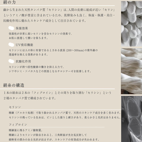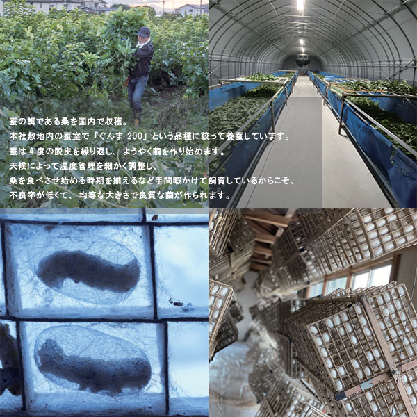 製糸(繭から糸にする)の時、繊維がほぐれやすくするために繭を煮立てます。 煮立てた繭は非常に腐りやすく、カビなどが生えやすいため、通常ホルマリンや防腐剤が使用されますが、 上州絹屋の原料は薬剤を使用せず製糸されていますので、安心安全にお使いいただけます。