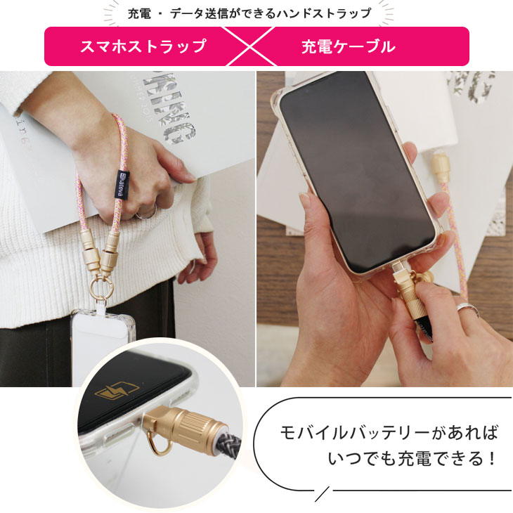 スタイリッシュなデザインと機能性を兼ね備えたスマートフォン充電ストラップ。 ファッションアイテムの一部となりつつスマホストラップに、充電コードを内蔵させ、より実用性の高いアイテムとなりました。 手首にかけたりカバンにつけて持ち運べるストラップとして使いながら、充電ケーブルとしてスマートフォンを充電することも可能です。 外出先でもスマートフォンに充電をサポートし、コードを忘れる心配がありません。 ![]()