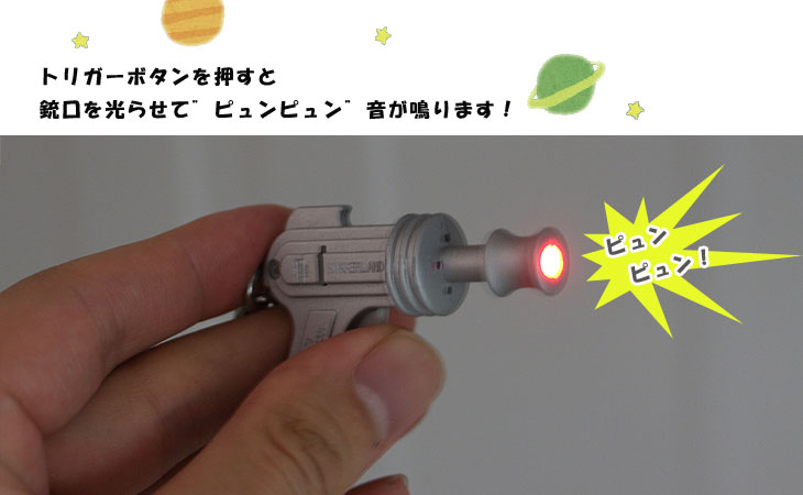 トリガーを引くとピュンピュン!と音を鳴らしながら光線を放ちます。 遊び心を忘れない、童心に戻れるスペースガン!