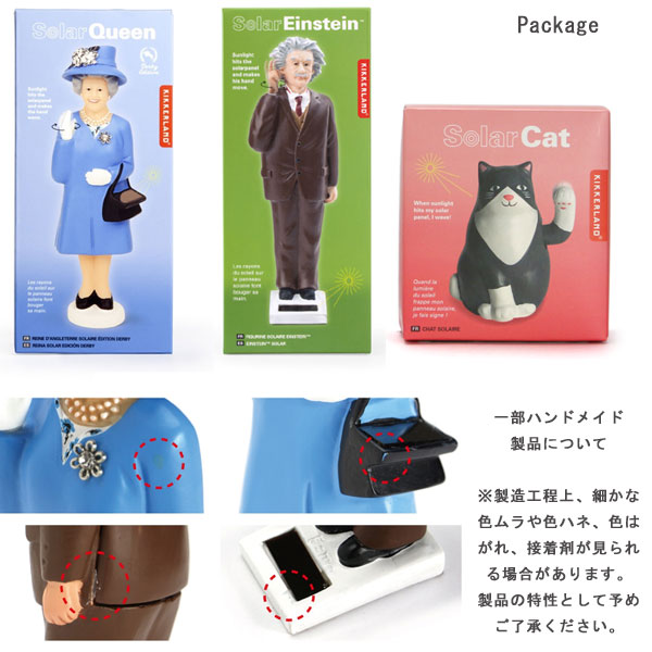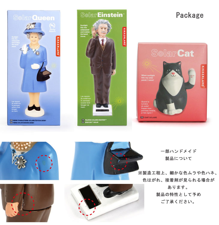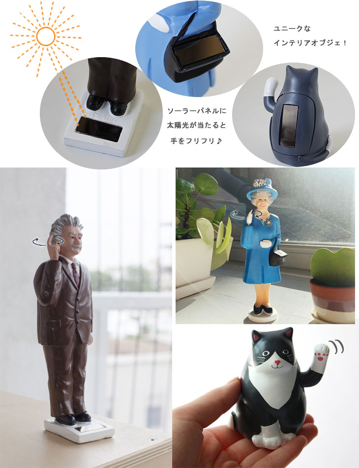 ご利益がありそうな、クスッとつい笑顔になるオブジェ。 窓際やラックのインテリアとして迎えいれてください。 玄関に飾ると、いってらっしゃいとお見送りしてくれているみたいで楽しいですよ。 ![]() かわいいパッケージで、ギフトにもおすすめです! ※製造工程上、細かな色ムラや色ハネ、色はがれ、接着剤が見られる場合があります。 製品の特性として予めご了承ください。 ※ソーラーパネルを動力とするため、直射日光の当たらない場所や、遮光ガラスなどでは動作しない場合がございます。 直射日光の当たる場所でご使用ください。 |