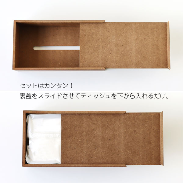 ★ティッシュの入れ方★ 1.ティッシュケースの裏側には、スライド式の裏板があります。 2.裏板スライドさせ開口します。 3.ソフトパックティッシュをセットし、裏板を戻します。