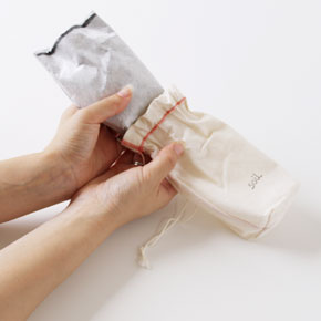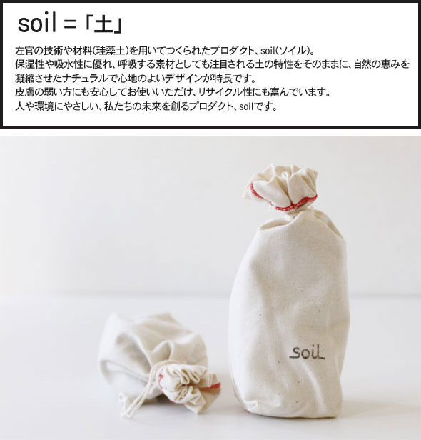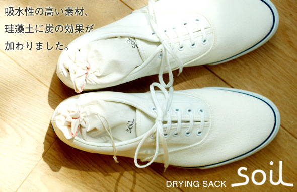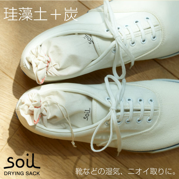 ![]() 吸湿性の高い自然素材、珪藻土(けいそうど)と炭でつくられたSoilの吸湿脱臭剤、ドライングサックです。 靴などの湿気とニオイをカットしてくれるのでジメジメする梅雨も、蒸れやすい夏も、ブーツでのお出かけが増える冬も、1年中活躍してくれます。 靴の中にドライングサックを入れておくだけで自然に吸湿、脱臭してくれるので お出かけ前はいつでも快適です♪ また、自然素材を使用しているので安心してお使いいただけますよ。 ![]() 自然な色合いの綿の巾着袋は清潔感があり、シンプルで優しい雰囲気をもたらしてくれます。 判を押したようなsoilのロゴと赤い糸のステッチデザインがポイントになっています。