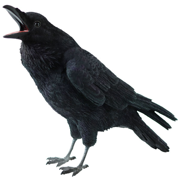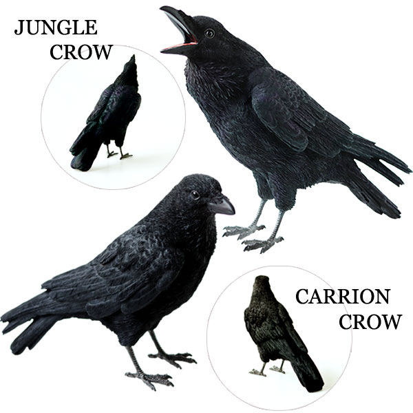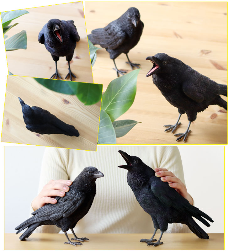 2種類のカラス。サイズや表情はそれぞれ違います。 羽根や質感など、リアルな仕上がりで本物と見間違ってしまいますよね。 材質は、割れにくく耐久性のあるポリレジン製です。 ■JUNGLE CROW 身長24.2cm。丸い瞳にお口を開けた表情がキュート!羽はまるで光が当たっているかのような質感♪ ■CARRION CROW 身長20cm。黒々としたボディがかっこいい、凛々しい表情がクール!