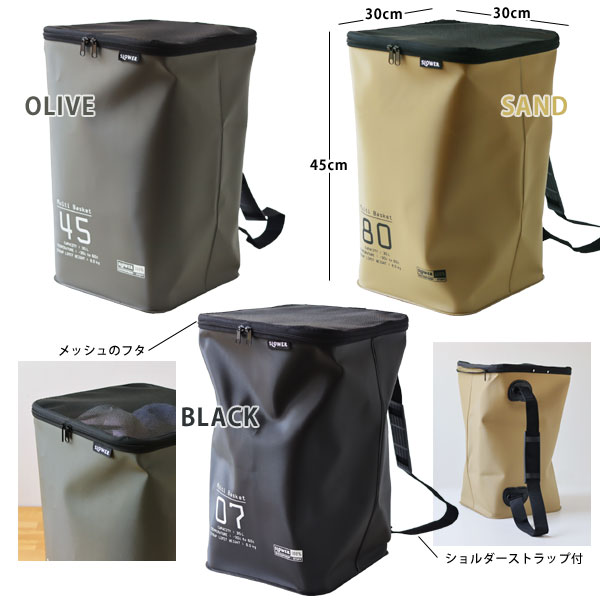 HANG STOCKシリーズは渋めのカラー「OLIVE・SAND・BLACK」の3色。 レジャー用品に合わせやすいアースカラーになっています。 深さのある縦長の本体はハリのある素材なので自立して形状をキープしてくれます。 だから洗濯物入れやゴミ箱にして使うことができます。 肩掛けの紐が付いているので持ち運びも簡単! 肩当て付きなので肩へかかる荷重による負担も和らげてくれます。 ストラップの耐荷重は8kgだから濡れて重くなった衣類を入れても安心です。 紐の長さは調整はできませんが、肩にかけて運ぶのにちょうど良い長さとなっています。 「ウォータープルーフ100%」 本体はEVA樹脂を熱圧着して形成されていますので水を遮断! 濡れてもOKなバスケットなら海水浴で濡れた道具もまとめて収納して運ぶことができます。 本体上部のメッシュのフタをダブルジッパーで閉じても適度な通気性が保てます。 水や汚れに強い素材なので、汚れたら水で丸洗いすれば簡単きれいに! 本体の素材感は外側はサラッと内側はツルっとしてどちらも水をはじいてくれます。