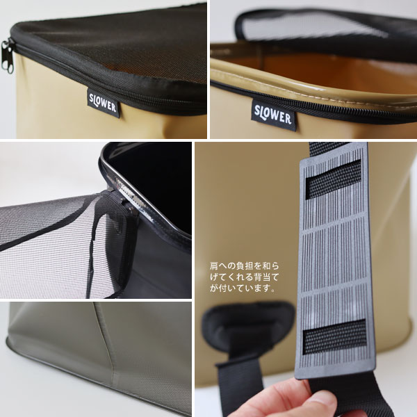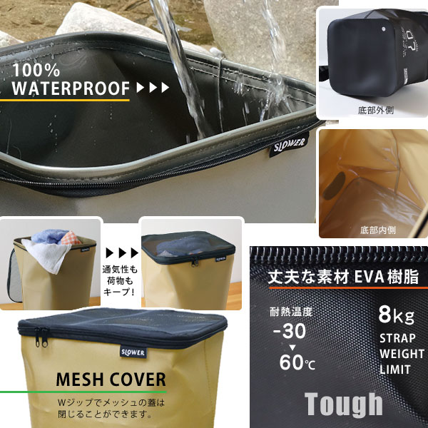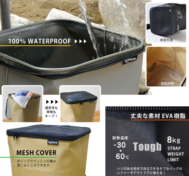 「メッシュの蓋」 本体上部にはメッシュの蓋がついていてWジッパーで閉じることができます。 蓋の一部は本体に取付けてあるので紛失して困ることもありません。 ブラックのメッシュで閉じれば荷物は見えにくくなり洗濯ものを入れても気になりません。 通気性があるので、濡れた衣類や道具を入れても中で蒸れにくいのもうれしい。 「丈夫な素材EVA樹脂」 非常に強度のあるEVA樹脂によって形成されたバスケットです。 耐熱温度は-30度から60度まで。氷水で飲み物を冷やすこともできますよ。 ショルダーストラップの耐荷重は8kg。 濡れたものは重くなり運びづらいので、肩掛けで運べるのは助かります。